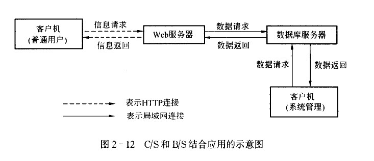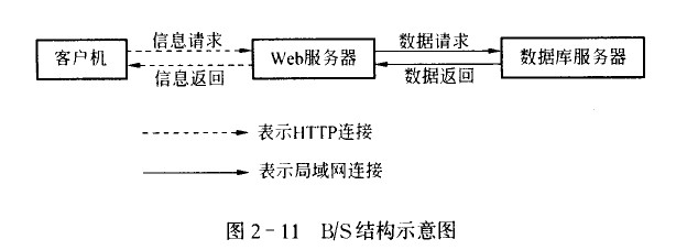 相對(duì)于C/S結(jié)構(gòu)而言,B/S體系結(jié)構(gòu)是把C/S結(jié)構(gòu)中的服務(wù)器分解為數(shù)據(jù)服務(wù)器和應(yīng)用服務(wù)器(Web服務(wù)器),同時(shí)將原來(lái)在客戶機(jī)一側(cè)的應(yīng)用程序模塊與顯示功能分開(kāi),將應(yīng)用程序模塊放到Web服務(wù)器上單獨(dú)組成一層,客戶機(jī)上只需安裝單一的瀏覽器即實(shí)現(xiàn)顯示功能,如圖2一11所示。