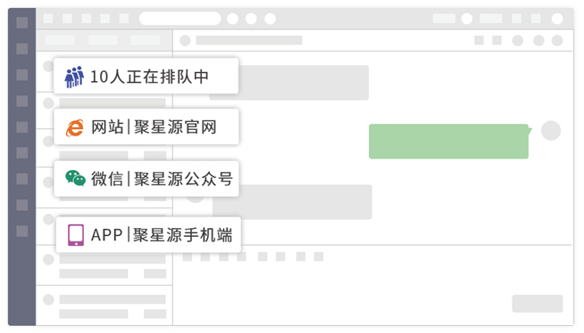 聚星源智能化在線客服系統涵蓋網頁在線客服、微信客服、APP客服、小程序客服、視頻客服、移動客服端等應用。所有渠道統一接入,統一排隊的方式,集中化統一管理。